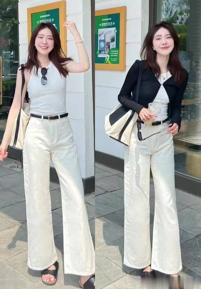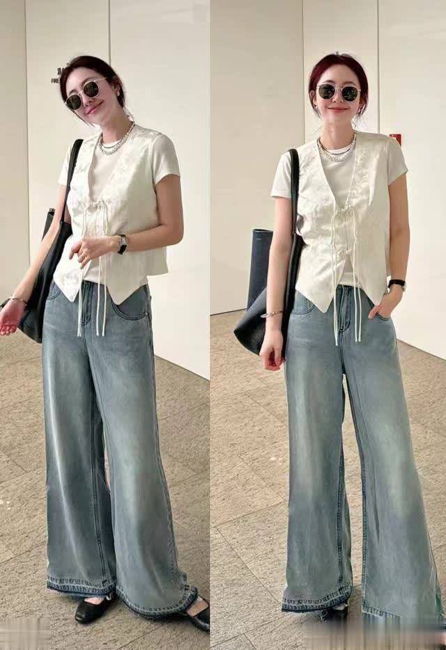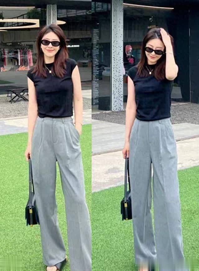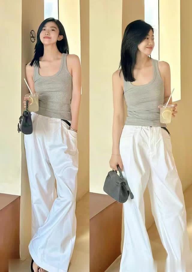浅灰色的背心,U领的设计不仅可以秀出精致的锁骨,还可以对颈部线条起到一定程度的修饰感,即使本人脖子偏短,也不用担心穿出笨重的既视感。配合白色阔腿裤的话,同样都是基础色系,简约风格也可以保持得很完美。