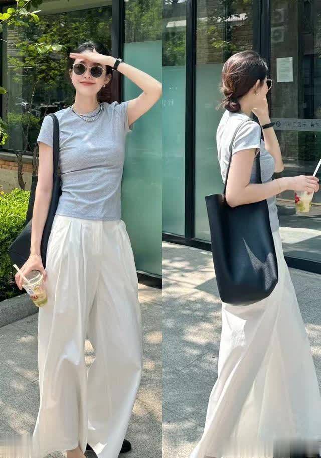 但是想要使造型叠加显瘦优势的话,那么阔腿裤在搭配方面肯定也要到位,例如说夏天人气很高的T恤,就更适合运用版型适中的款式。
